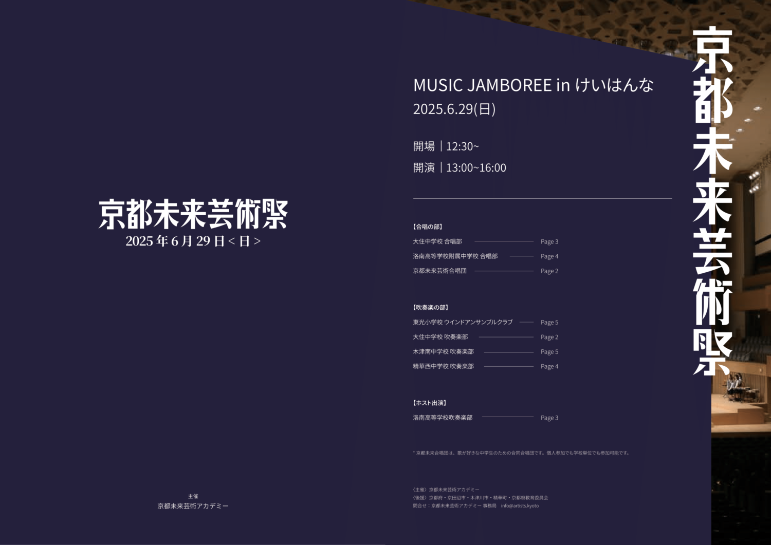 2025年6月29日に、けいはんなホールにて「Music Jamboree in けいはんな」を開催しました。当日は関係者を含め300名以上の方々がご来場くださり、無事にフィナーレを迎えることができました。
