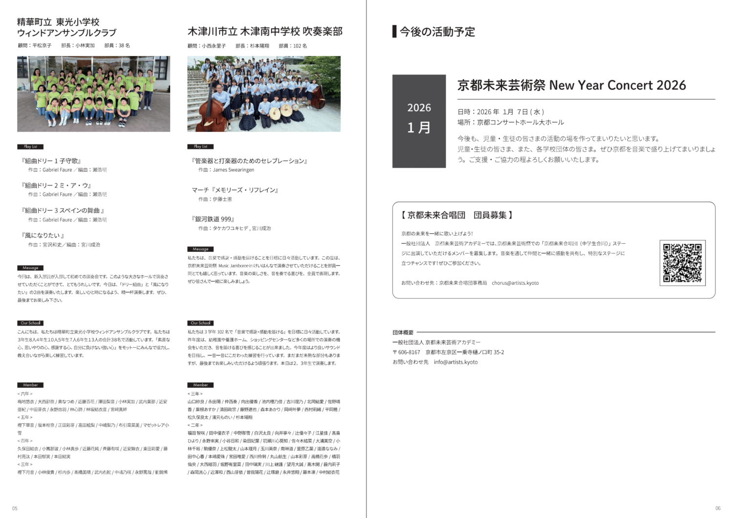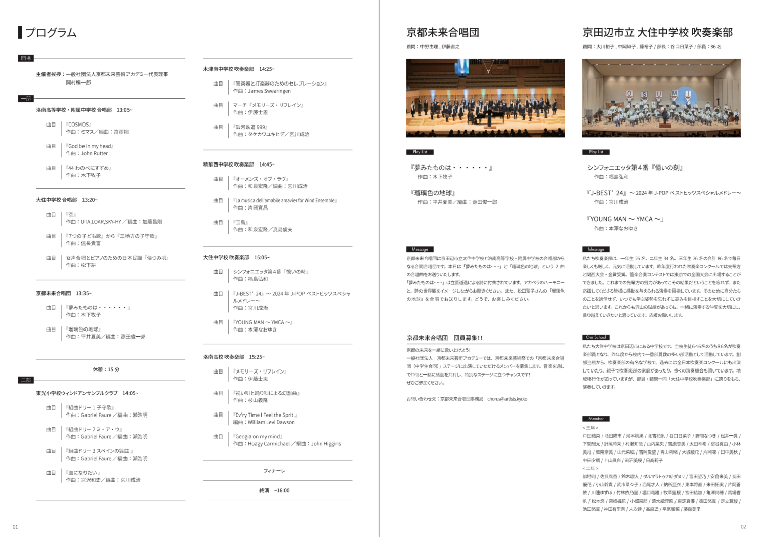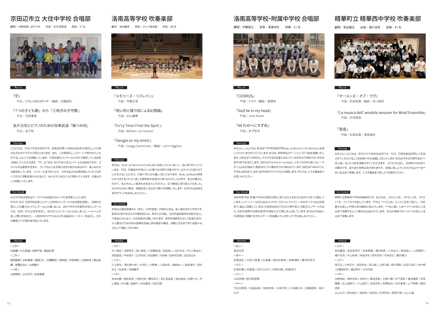 参加してくれたのは、京都府南部6校の合唱・吹奏楽部です。演奏、合唱経験の豊富な生徒たちが素晴らしいパフォーマンスを披露してくれました。吹奏楽部では、コンクールへの出場経験を持つ小中学校や、ショッピングセンター・養護施設など幅広く校外で活動している中学校などが参加してくれました。合奏の定番曲からJPOPのヒットメドレーまで、多彩な楽曲を演奏してくれました。合唱部では、民謡やわらべうた、定番の合唱曲を息の合ったハーモニーで届けてくれました。